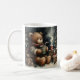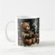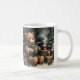 Adorable teddy bears sitting in front of a Christmas tree dressed in sweaters, the larger bear is holding a mug while he sits beside a stack of gifts with a candle billowing smoke. A beautiful script in the middle that says Christmas.