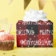 White MERRY CHRISTMAS text with snowflakes on red and black buffalo plaid background.