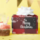 White Merry Christmas text in a snowflake pattern on black and red buffalo plaid background.