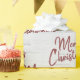 Red Merry Christmas text on white birch texture background.