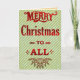 This festive greeting card design features the words "Merry Christmas to All" in bright red lettering with various fonts and flourishes. At the bottom, it has a bigger mistletoe flourish with green leaves and small red berries. This all rests on a light green striped background made to look discoloured and speckled in a vintage / antique way. The inside has a vintage, worn colouring to it with more white speckles that look like falling snow. It also has space for you to add your personal message -- or simply delete the sample text to leave it blank. You can also click "Customise It" for more features -- such as adding your own photo to the inside left side. This is a simple, elegant old-fashioned card for the xmas winter holiday season. See matching items in our store.