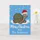 Wish people a Merry Christmas with this cute cartoon tortoise wearing a red and white Santa Hat standing in the snow. Below the illustration is a template to add your family name to personalise.