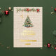 A rustic faux beige burlap background. Decorated with a Christmas tree and a pine garland with red poinsettia flowers. Real gold foil on the front. Your text and names on the back. Merry Christmas is written with a retro style font.
