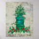 A "Merry Christmas" poster decorated with a farmhouse collage design featuring decorated pine branches a vintage milk can with red ornaments along the base on a vintage script paper background.