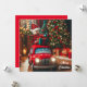 Merry Christmas tree red car bringing gifts on Christmas evening holiday card.