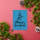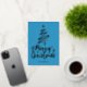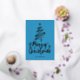 Blue background with silver foil Merry Christmas decorative script style with an outline of a Christmas tree and star on top. This Christmas card is designed so you can change the colour of the background and also enter your family name.