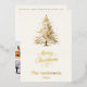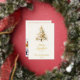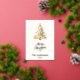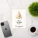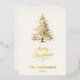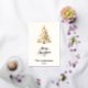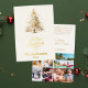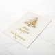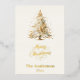 A beige, off-white background. Decorated with a snowcoverd Christmas tree. Real gold foil on the front. Your text and names on the back. Merry Christmas is written with a hand lettered style font.