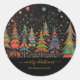 Colourful Merry Christmas Trees classic round sticker. Personalise with your name.