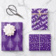Merry Christmas, trees and polka dots purple holiday Wrapping Paper Sheets. The first sheet features white winter trees on purple background. The second showcases the text :"Merry Christmas" in bold typogtaphy and the third displays polka dots-snow.