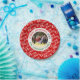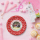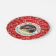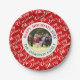 Merry Christmas typography and photo red holiday paper plate. It showcases the text : "Merry Christmas" in script typography and a family photo in a circle on the front and the back.