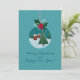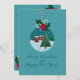 Festive teal holiday card featuring a glass ornament with a snowy village and Christmas tree, topped with holly and a red bow. Snowy background and hand-lettered greeting. Personalize the names, year, and inside message—perfect for family, friends, teachers, and coworkers.