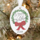 This pretty holiday ornament features a simple yet beautiful design with a hand painted watercolor wreath of green pine branches and red berries with a big red bow. Across the wreath in elegant script lettering reads the greeting: Merry Christmas! Below is space for the year. On the back is space for a photo with your own custom caption. Great Christmas gift or as an annual holiday memento.
