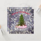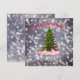 Merry Christmas, snowing day, spruce and white bunnies. Christmas greeting card.