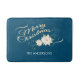 This bath mat features a vintage inspired digital graphic of a white poinsettia on a dark blue background. The script text, in a gold gradient colour, reads: Merry Christmas. Customisable text allows you to personalised with your name.