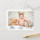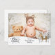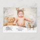 This cute Christmas postcard features a snowy frame on the lower part, with the caption "Merry Christmas" on the left side, and a lovely reindeer with snowflakes on the right side. The picture portrays an adorable baby with a reindeer hat and a teddy bear by his side.