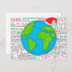 This postcard is printed with a hand-drawn globe with a festive Santa Clause hat. The background features the saying "Merry Christmas" in various languages including English, Spanish, French, Russian, Xhosa, and more!