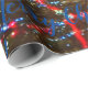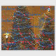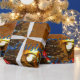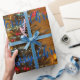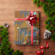 Merry Christmas stylish blue typography, with a cheery Christmas trees in front of a building with wall lights repeating pattern design for your festive joy.
