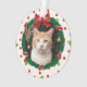 Festive custom pet Christmas ornament featuring a green and red wreath on a holly leaf and berry background. Replace the cat picture in the wreath with a photo of your cat or dog. It would also work great with a picture of your child or a family photo.