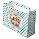 Merry Christmas floral wreath with teal blue polka dot pattern photo large gift bag. Personalise with your own photo and text.