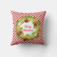 Polyester square pillow features Merry Christmas text in holiday wreath on red and white striped pattern.