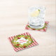 Paper coaster features Merry Christmas text in holiday wreath on red and white striped pattern.