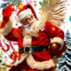 A vibrant illustration of Santa Claus, joyfully waving with a broad smile. He wears a classic red suit trimmed with white fur, complemented by a fluffy hat. His wings, adorned with feathers, add a whimsical touch.