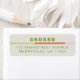 Coordinates with four photo festive merry bright holiday card design. This is a return address label with a bold family name and colourful line detail with light green, dark green, red, and soft pink.