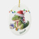 On the front of this keepsake ceramic ornament for a child is an adorable baby dinosaur wearing a Santa hat. He has a Christmas tree bulb between his feet, and a gift package beside him. There's a string of Holiday lights behind him. Your child's name is in dark green at the lower right. The back of the ornament has a Merry Christmas message and your signature. Perfect for a daughter, son, granddaughter or grandson who loves dinosaurs.