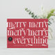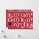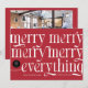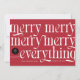 On a vibrant red background, the words "merry merry merry merry everything" are displayed in a large, trendy serif font in crisp white. This playful repetition of "merry" creates a visually striking and memorable effect, while the all-encompassing "everything" adds a touch of warmth and inclusivity. The modern typography gives the card a contemporary feel, ensuring it stands out in a sea of traditional holiday greetings.
