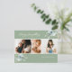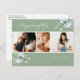 Merry Everything script. Watercolor arctic winter botanical arrangements, sage green photo collage holiday postcard. Card features three photos on front with multiple template text lines on back of card for your address, message, names & year.