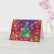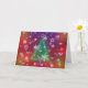 A scattering of white snowflakes, holly leaves and berries, stars, and pine trees against a glowing background of red, orange, gold, and purple, with a soft green Christmas tree shape in the middle.