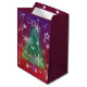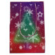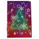 A scattering of white snowflakes, holly leaves and berries, stars, and pine trees against a glowing background of red, orange, gold, and purple, with a soft green Christmas tree shape in the middle.