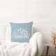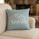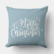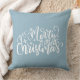 Cute light blue pillow in country farmhouse style. "Merry Christmas" quote text written as calligraphy wordart.