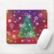A scattering of white snowflakes, holly leaves and berries, stars, and pine trees against a glowing background of red, orange, gold, and purple, with a soft green Christmas tree shape in the middle.