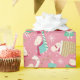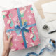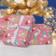 This roll of wrapping paper features a whimsical illustration festive little mice engaged in several different kinds of winter activities: skiing, ice-skating, napping in a mitten, admiring the snow, and jump roping with string lights. On a pink background. Perfect for both kids and adults alike. Teal green and navy blue also available on rolls or flat sheet options. See Clearlytangled Studio's for all the options.