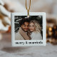This holiday ornament is designed for newlyweds celebrating their first married Christmas, blending modern simplicity with seasonal charm. It features a photo that you can upload to showcase your favourite moment together. The phrase "merry & married" in a bold typographical design is accompanied by a delicate heart next to it.