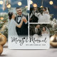 Minimalist newlywed keepsake ornament featuring 3 custom photos of your wedding day, the cute saying 'merry & married', your family name, and the year.