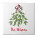 Merry Mistletoe with white berries tied up in a red ribbon nestled atop a doorway awaiting those to stand underneath. A lovely and simple design that depicts a simple and classic Christmas element. A wonderful design for any holiday occasion.
