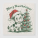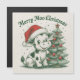Vintage cartoon-style Christmas illustration of a cute baby calf character wearing a Santa hat, leaning cosily against a decorated Christmas tree, with gentle snow falling around. The calf has big expressive eyes and a friendly smile, drawn in a hand-engraved pencil and ink style with nostalgic holiday vibes. Include classic vintage linework, shading details, and printed texture as if made for an old Christmas postcard or t-shirt. Use monochrome green ink on beige paper background. Add retro curved typography above saying ‘Merry Moo Christmas’ in classic serif vintage font.
