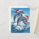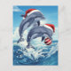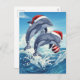 Send a splash of holiday cheer with this fun, vibrant postcard! Two cheerful dolphins leap joyfully out of a blue ocean wave, both wearing classic Santa hats. One dolphin is playfully balancing a red and white striped Christmas ornament on its nose. This lively illustration is perfect for anyone celebrating a warm-weather or coastal Christmas, or for sending a unique greeting that captures the fun and energy of the ocean holiday season!