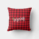 This pillow features a red and black buffalo plaid pattern. The word MERRY is written in a pretty script in the centre and a holly leaf and berry decorate the corner of the M. Design is the same on the reverse side.