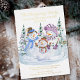 Luxury Foil Christmas card from your new home. The wording reads "the ... family have a new home for the holidays" followed by your personalised christmas greeting and new address. This watercolor design features 3 cute snowmen with a backdrop of christmas trees.