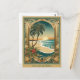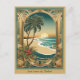 This tropical Christmas postcard features a traditional art nouveau style image of a golden arch with a palm tree, beach, and beautiful sunset.