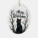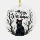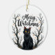 Celebrate a magical holiday with this "Merry Witchmas" ornament, featuring a black cat with devilish red horns amidst an enchanted forest scene. Perfect for those who love a touch of witchy charm in their holiday decor, this ornament adds a mystical vibe to any Christmas tree or seasonal display