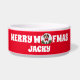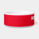 This unique custom pet dog or cat bowl features their name personalised in classic all-caps serif text with a background in red colour. A stylish water and food bowl for your furry family member, available in medium and large sizes.