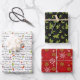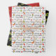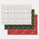 Christmas greetings with mini icons on white, Holly and white dots on black, Multi-colored snowflakes on red wrapping sheet set.