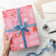 This retro inspired Christmas gift wrap is perfect for kid's Christmas presents. This cute design features a pink background with text in a fun font that says Merry XMAS. Christmas trees snowflake ornaments, and botanical accents in red and white complete this cute holiday gift wrap.
