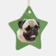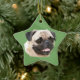 This cute Pug portrait is on an ornament with a Christmas green background. You can add text or images to the back as well.