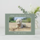 Miss you card to share digitally. Miss you so much card with custom text. A white poodle is covered with sand and looks forlornly at a ball on the beach. Along the top, the text is, “Without you, I’m a real mess”. Beneath the image another line of text reads, “Miss you so much”. Personalise the text as you like, and change the photo. Sage green colour with paw print pattern on reverse.