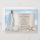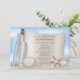 Beach bridal shower invitations, exclusively designed by Artistically Invited, with a glass bottle illustration with a tattered paper message design in the sand, complete with sea shells, sand dollars, and a starfish. Your personalised bridal shower details are custom printed in brown over the paper illustration. These are the perfect invitations for your beach themed bridal shower celebrations.